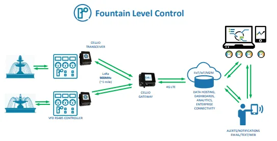 Cellio utilizes a collection of Transceivers which connect to various sensors and controllers. The Transceivers communicate via 915 MHz LoRa radio over a one-mile line-of-site to an LTE cellular gateway, aggregating all the Transceiver data and sending it to a backend server application for storage, visualization, analytics, and alerting. Utilizing a unique, proprietary “always on” feature developed by Device Solutions, Semtech LoRa enabled remote transceivers in underground vaults to actively listen to a centralized Gateway for real-time commands to control large VFD motors remotely used to control ornamental fountain levels.